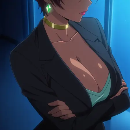 prompts: 1girl, solo, mature female, milf, brown hair, short hair, pixie cut, large breasts, dark-skinned female, hidden eyes, no eyes, faceless, shaded face, no eyebrows, earrings, green diamond earrings, choker, golden choker, lipstick, black blazer, pencil skirt, high heels,