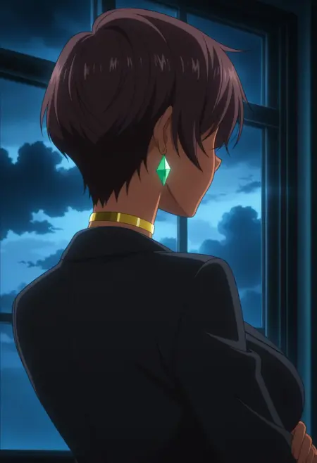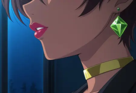 提示词:1girl, solo, mature female, milf, brown hair, short hair, pixie cut, large breasts, dark-skinned female, hidden eyes, no eyes, faceless, shaded face, no eyebrows, earrings, green diamond earrings, choker, golden choker, lipstick, black blazer, pencil skirt, high heels,