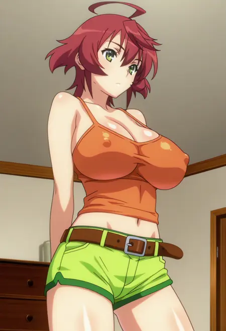 Yurine(红发):yurineh,1girl,solo,green eyes,red hair,short hair,ahoge,large breasts,orange tank top,cleavage,covered nipples,midriff,navel,green shorts,belt,impossible clothes,