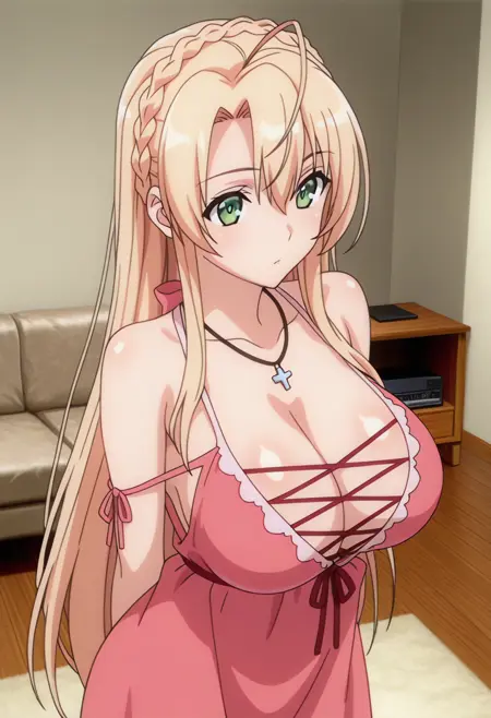 Noemi(金发):noemih,1girl,solo,green eyes,long hair,blonde hair,hair between eyes,antenna hair,braid,ahoge,large breasts,pink dress,bare shoulders,cleavage,necklace,jewelry