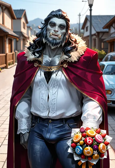 FDDY, 1boy, male focus, solo, beard, pants, facial hair, colored skin, burgundy cape, white shirt, muscular, jeans, fur trim, holding candy bouquet, pectorals, jewelry, partially unbuttoned, sharp fingernails, black nails, dark eyes,