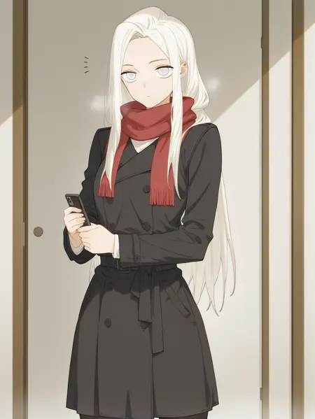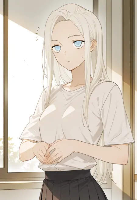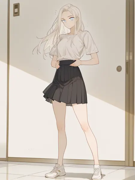 南号尚风妹妹:BYH, 白发, 长发, 齐刘海, 蓝眼, 中等胸部, 白色衬衫, 黑色百褶裙, 白色运动鞋,