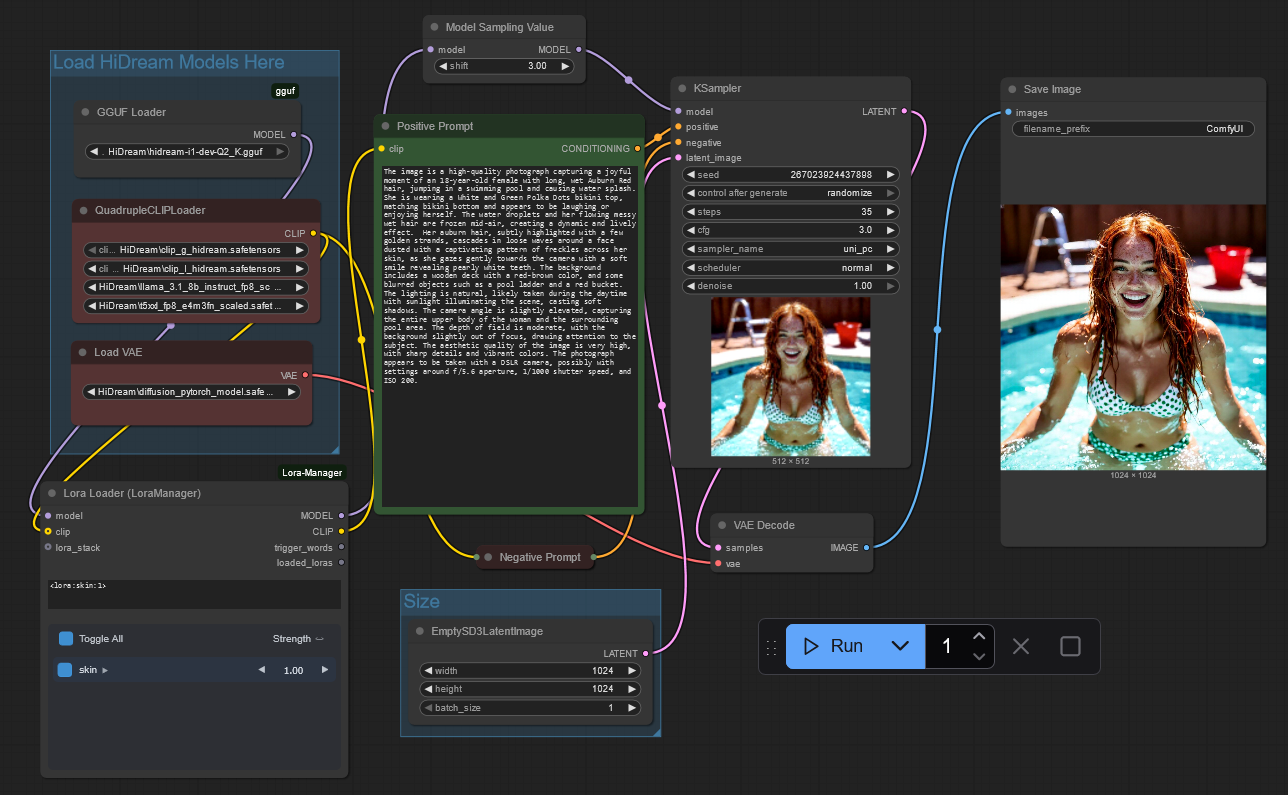 이것은 단일 HiDream GGUF 모델과 여러 LORA와 함께 작동하는 매우 간단한 ComfyUI 초보자 친화적인 텍스트-이미지 워크플로우입니다. (이 워크플로우는 ComfyUI의 LORA Manager 플러그인이 필요합니다. Checkpoints, LORA 및 기타 리소스를 쉽게 다운로드하고 관리하는 데 도움이 되므로 ComfyUI Manager와 LORA Manager 플러그인을 모두 설치하는 것이 좋습니다. 이 두 가지는 이 워크플로우에만 유용한 것이 아니라 다른 모든 경우에도 큰 도움이 됩니다.) 또한 이 워크플로우와 함께 모든 필요한 모델 다운로드 스크립트(Windows 및 Linux/Mac용)를 포함시켰습니다. 이러한 스크립트는 SD 1.5, SDXL 1.0, Flux GGUF 및 HiDream GGUF 핵심 파일을 모두 다운로드해 주므로, 즉시 AI 아트 생성을 시작할 수 있습니다. ComfyUI Manager를 사용하여 ComfyUI에 GGUF 애드온을 설치하고, 올바른 파일을 올바른 위치에 배치했는지 확인하세요. 또한 SD 1.5 + SDXL 1.0 및 Flux용 다른 내 워크플로우도 확인해 보세요.