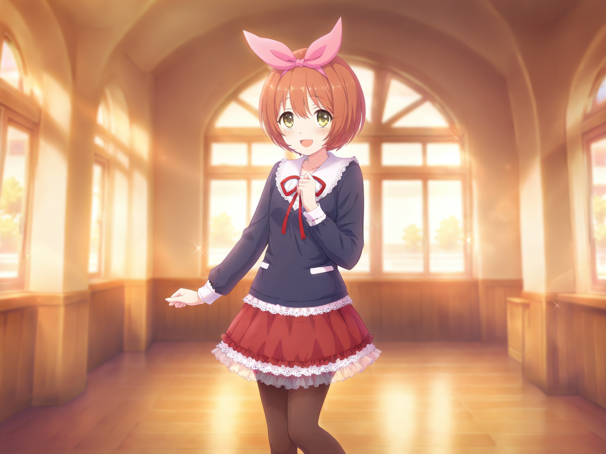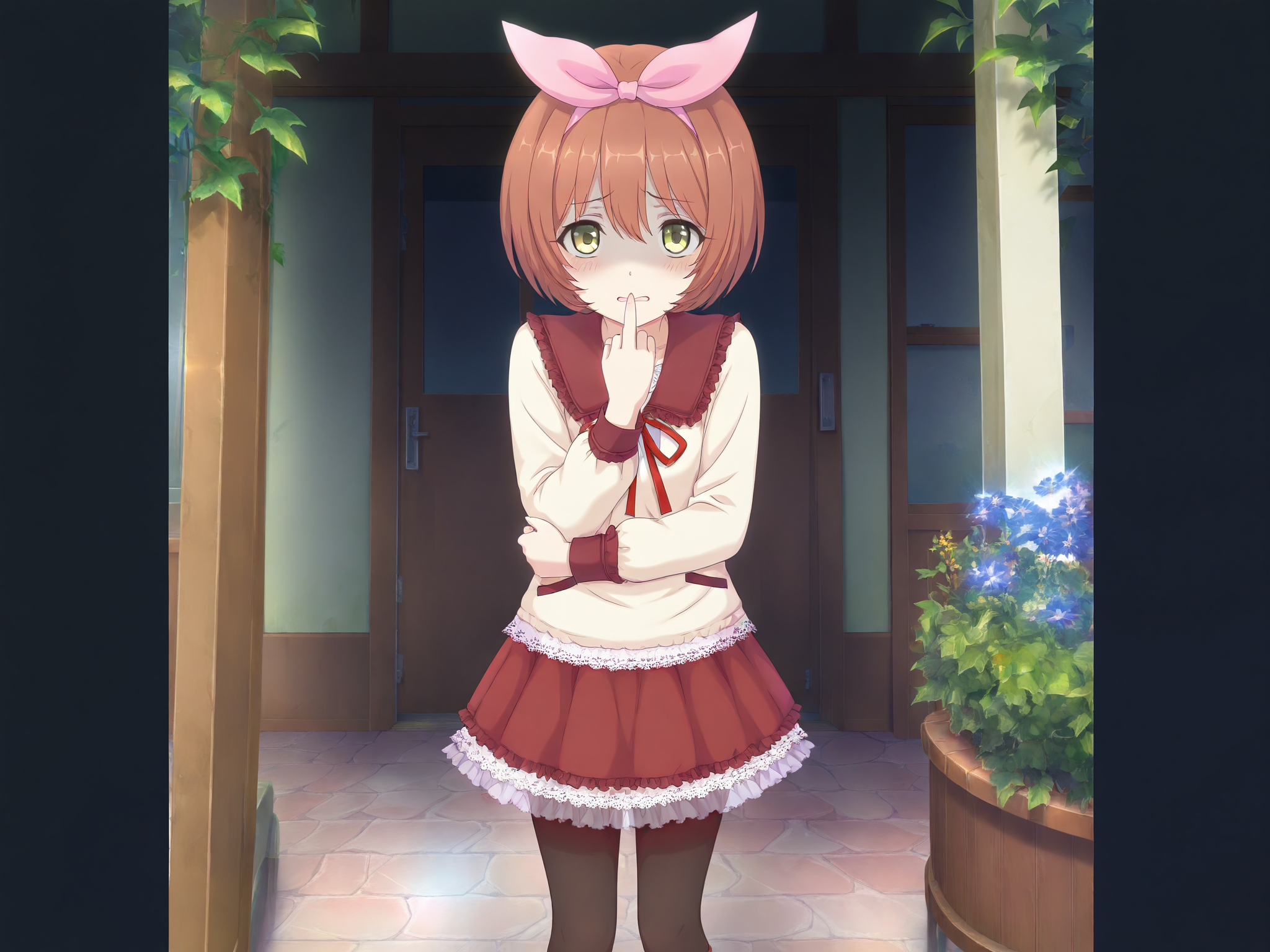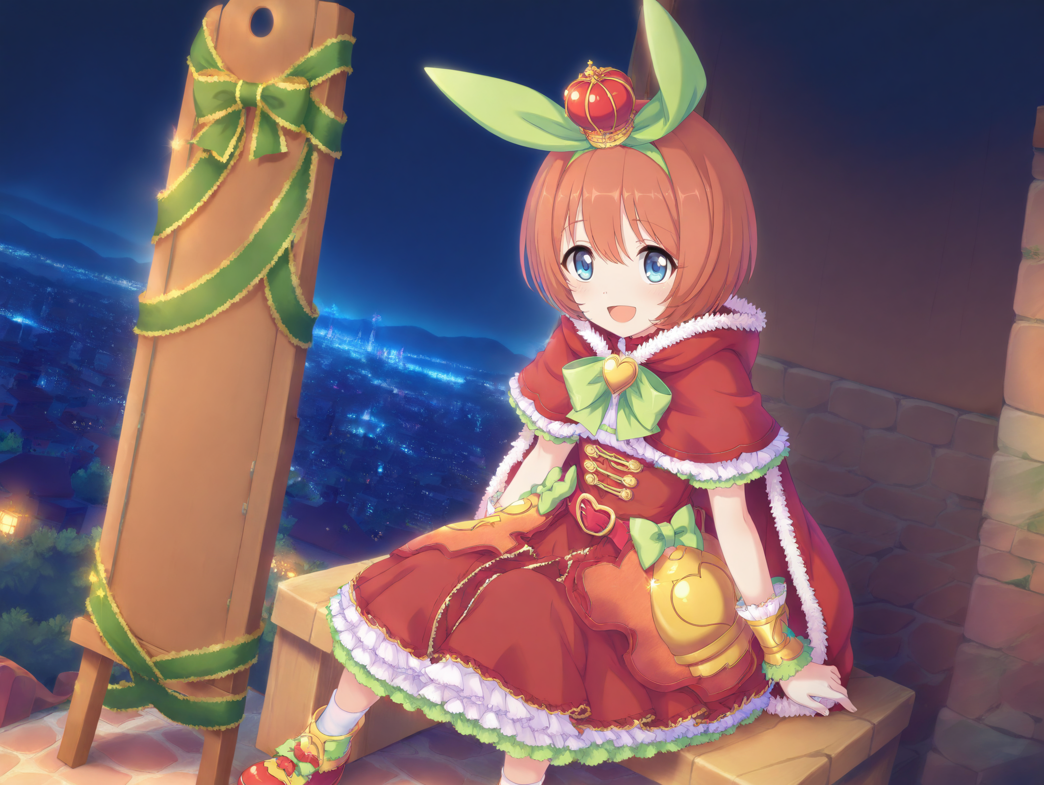 front view,absurdres,official style,more details,lora:Kurumi5464:1,1girl,mini crown,white socks,brown hair,red belt,green bow,green ribbon,red footwear,blue eyes,red capelet,red cloak,green hairband,red dress,frilled dress,orange hair,night,cityscape,sitting,solo,