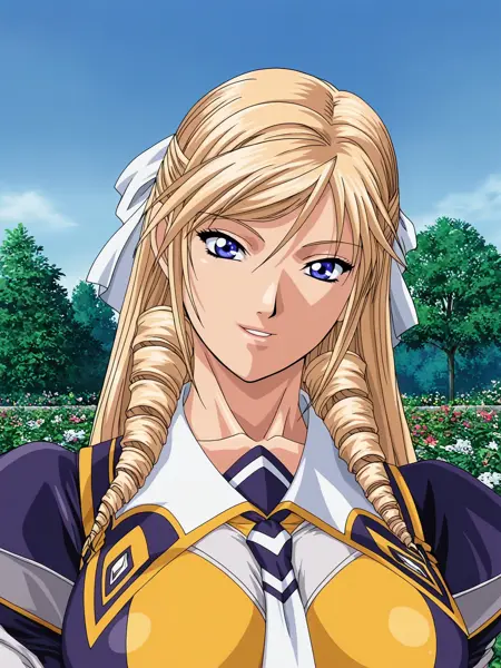 Leona Morimoto, 1girl, 금발, 긴 머리, 트윈 드릴, 파란 눈, 반쪽 위로 묶은 머리, 머리 리본, 흰 리본
