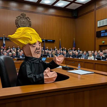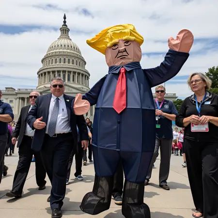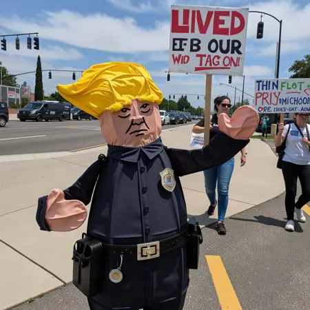 为捕捉唐尼超现实的心理状态,我们精选了25张图像,展现他在不同场景中的新形象:站在“细蓝线”旗帜前摆姿势、骑在自制炸弹上、在“No Kings”抗议活动中佩戴王冠。我们使用标准的Kohya_ss训练参数——专为创意性、诗意化提示与电影化场景优化——将唐尼潜意识的本质提炼为一个能生成生动梦幻场景的模型。