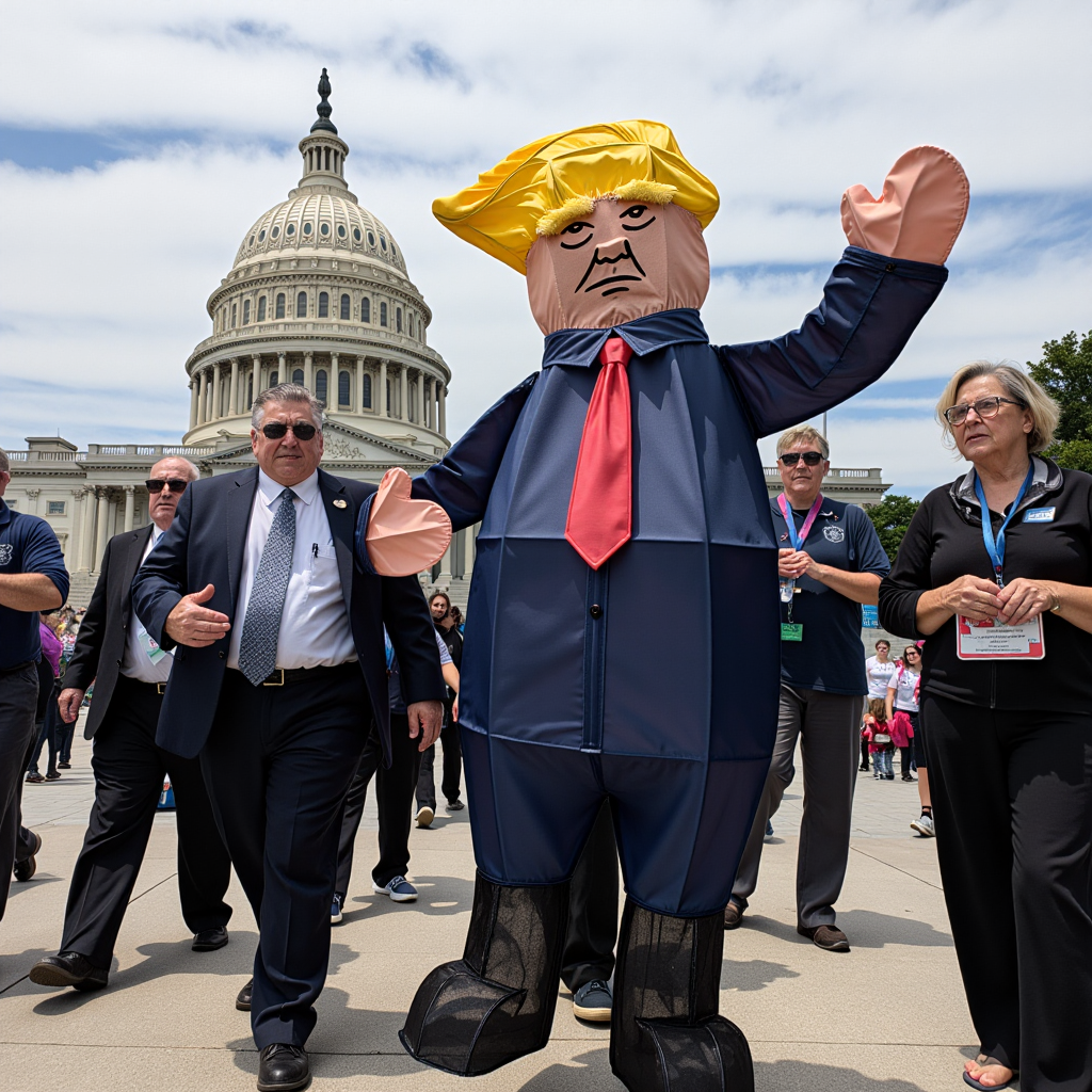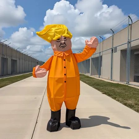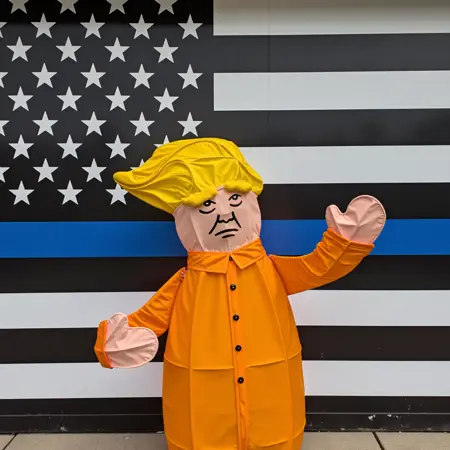 并非所有英雄都从荣耀中开始他们的旅程。我们的主角,亲切地被称为唐尼,最初只是一个普通的圣诞老人草坪装饰品,曾传播着好消息,直到他的魔力消退。本应被送往垃圾填埋场的唐尼,被我的妻子救下,她看到了他金属框架中的潜力。她用橙白相间的防撕布为他重塑形象,让他穿上橙色监狱连体服,化身DJT。重生后的唐尼开始在本地公园和政治集会中冒险,他的新身份既是评论,也是奇观。随着时间推移,唐尼开始做梦,而他的梦境——如同他的名字所暗示的那样——宏大、狂野,又略带粗鄙。