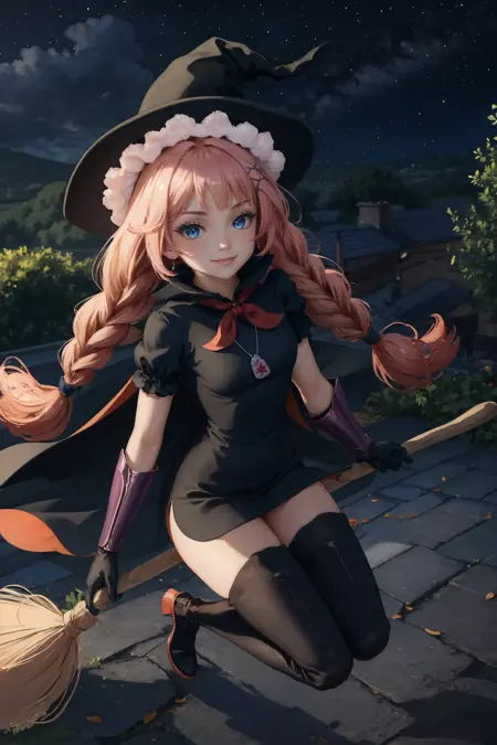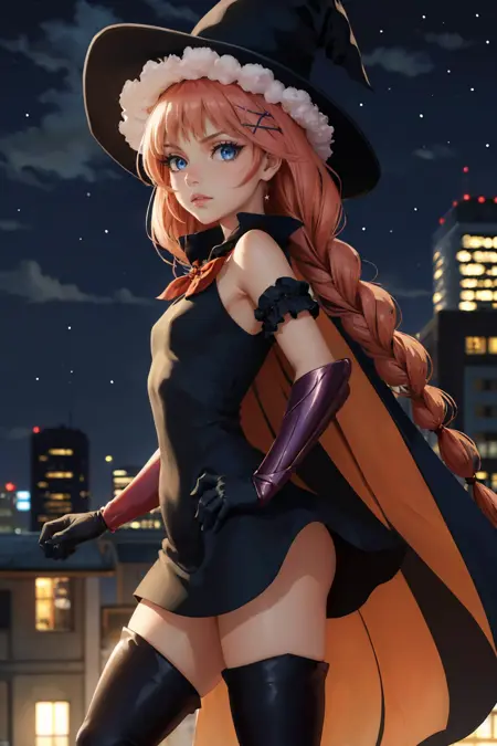 Add "twin braids, witch hat, necklace, black dress, black cape, bow, elbow gloves, thigh boots" for her typical look.