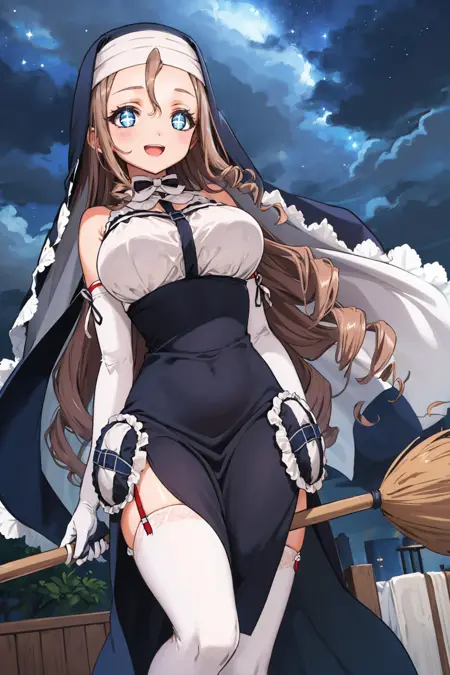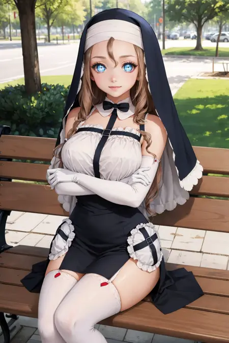 Add "symbol-shaped pupils, nun, veil, black dress, elbow gloves, white thighhighs" for her typical look.