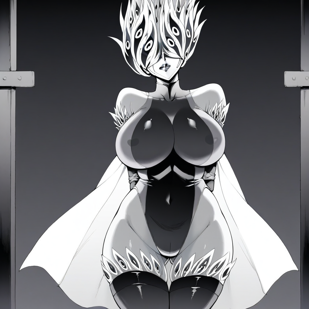 rorsch, mask, extra eyes, leotard, elbow gloves, black leotard, curvy, shawl, thigh highs, mature woman, red lips,