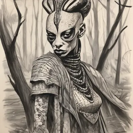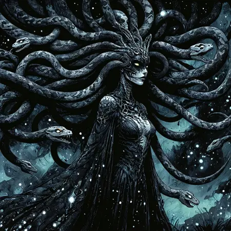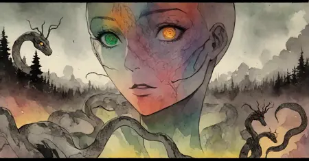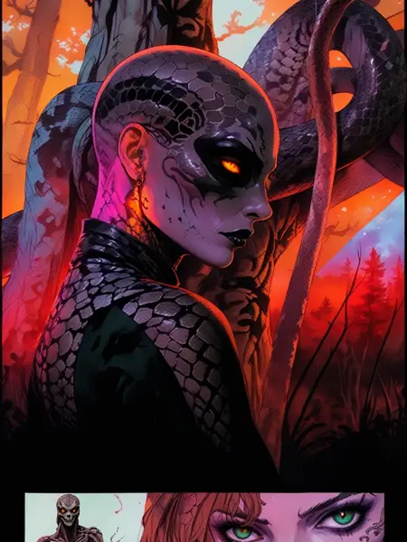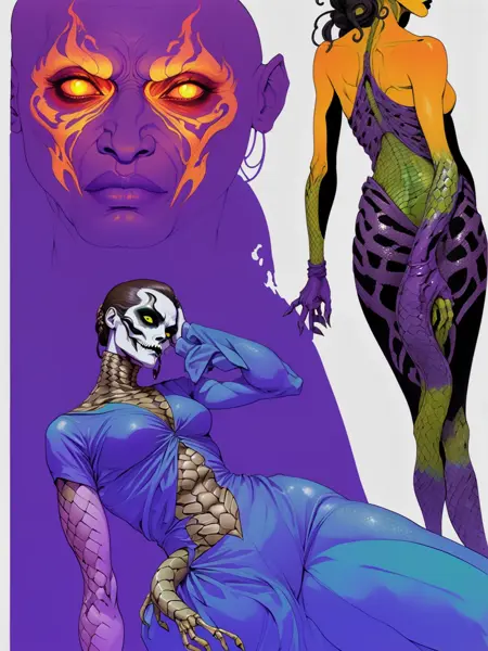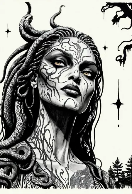 다양한 거친 만화 메두사 스타일로 학습된 LoRA. 조엘 존스와 션 고든 머피가 손으로 그린 잉크, 프레데릭 덜라비에의 내부 골격 해부학, 블랙메탈 코프페인트, 파인 바렌스, 불꽃, 뱀 피부 드레스, 머리에 뱀이 얽혀 있는 대머리, 그레이스 존스와 유사한 외모. 37장의 이미지로 45단계 학습.