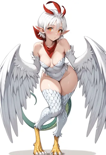 cockatricemge, monster girl, harpy, pointy ears, feathered wings, winged arms, talons, yellow talons, white claws, digitigrade, plumage, white feathers, red hair feathers, chicken comb, hexagonal scales, white scales, lizard tail, green tail