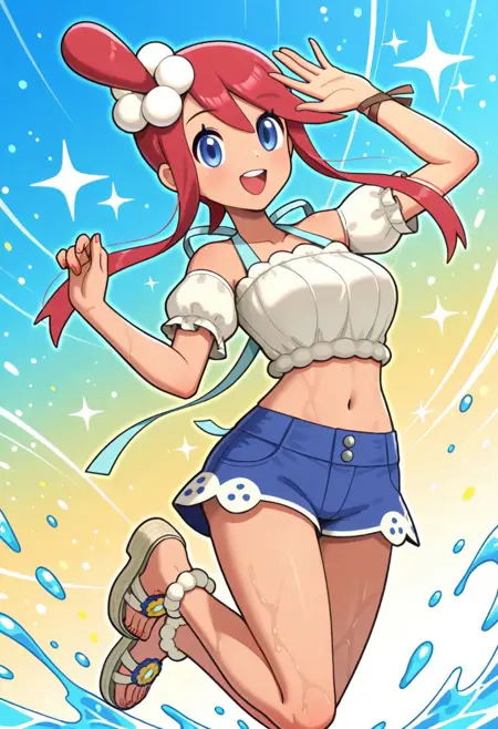 sumskyla, skyla \(pokemon\), blue eyes, red hair, one side up, bangs, short hair with long locks, dark-skinned female