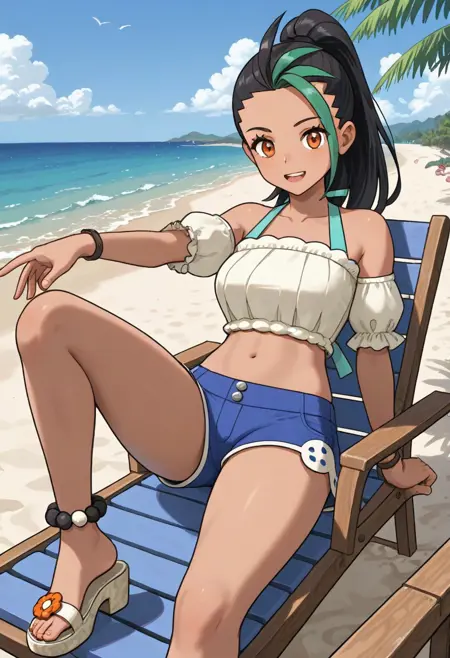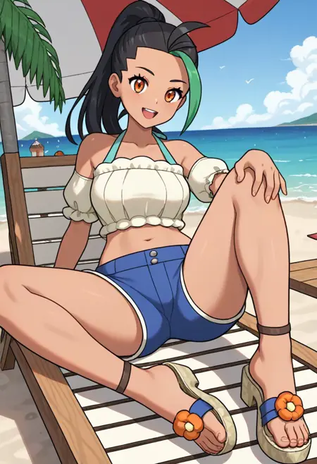 헤어 장식, 헤어 비즈, 크롭탑, 어깨 드러난 셔츠, 흰색 셔츠, 퍼프 슬리브, 프릴, 스파게티 스트랩, 파란 리본, 드러난 어깨, 복부, 배꼽, 단일 팔찌, 짧은 반바지, 청바지, 비즈 앵클릿, 샌들, 발가락 네일, 신발 장미, 흰색 신발