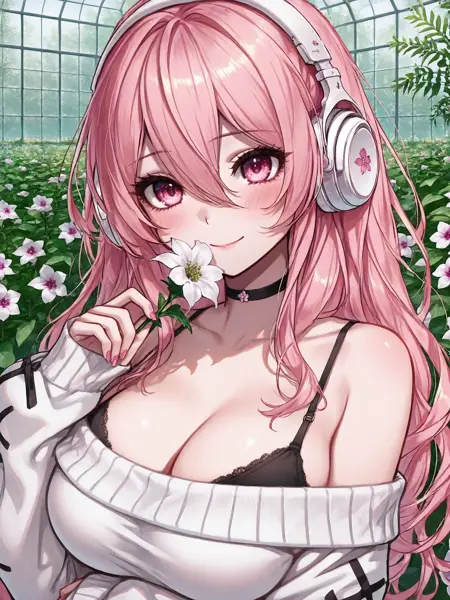 Outfit: headphones, choker, black choker, sweater, white sweater, off-shoulder, off-shoulder sweater, long sleeves, sleeves past wrists, bare shoulders, bra strap, cleavage, thighhighs, black thighhighs