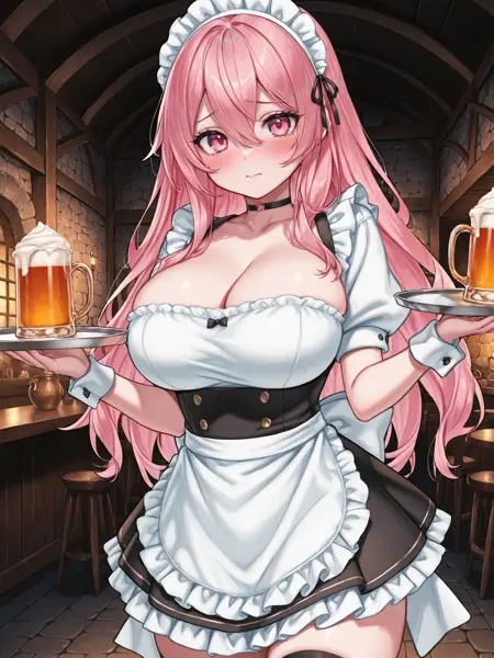 General: 1girl, solo, long hair, pink hair, hair between eyes, pink eyes, breasts, large breasts, pink nails