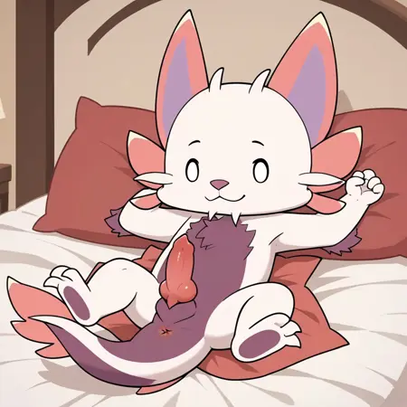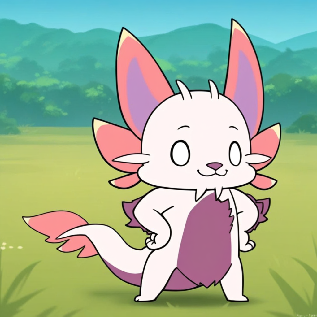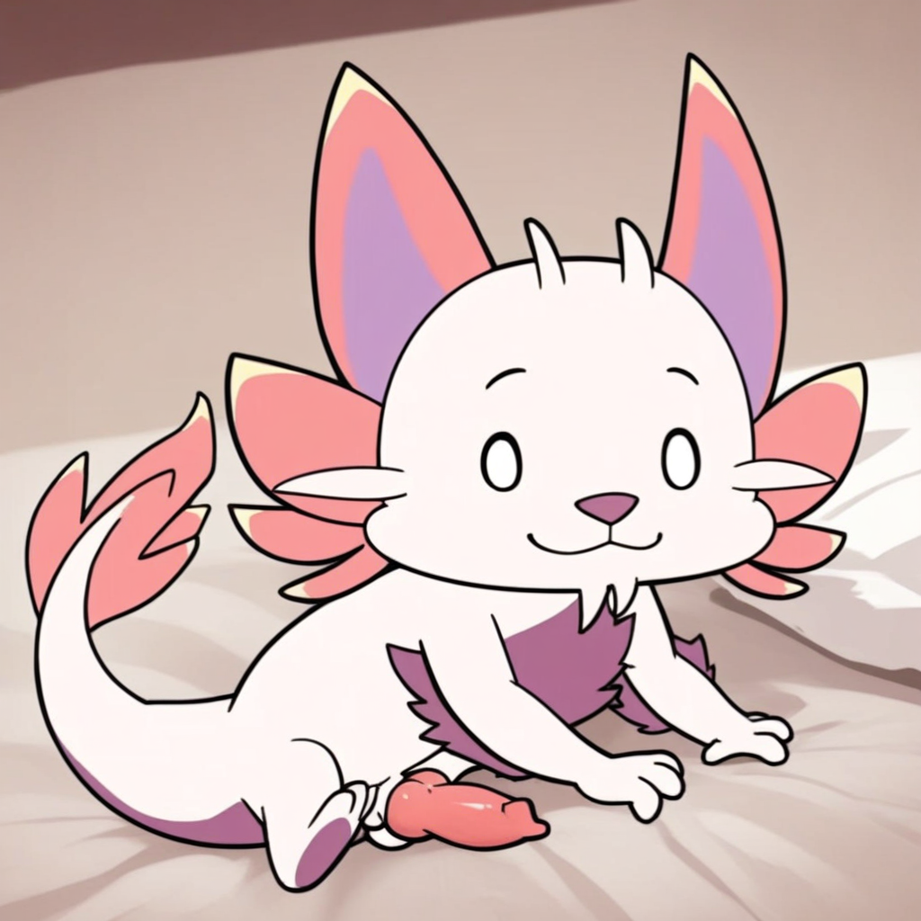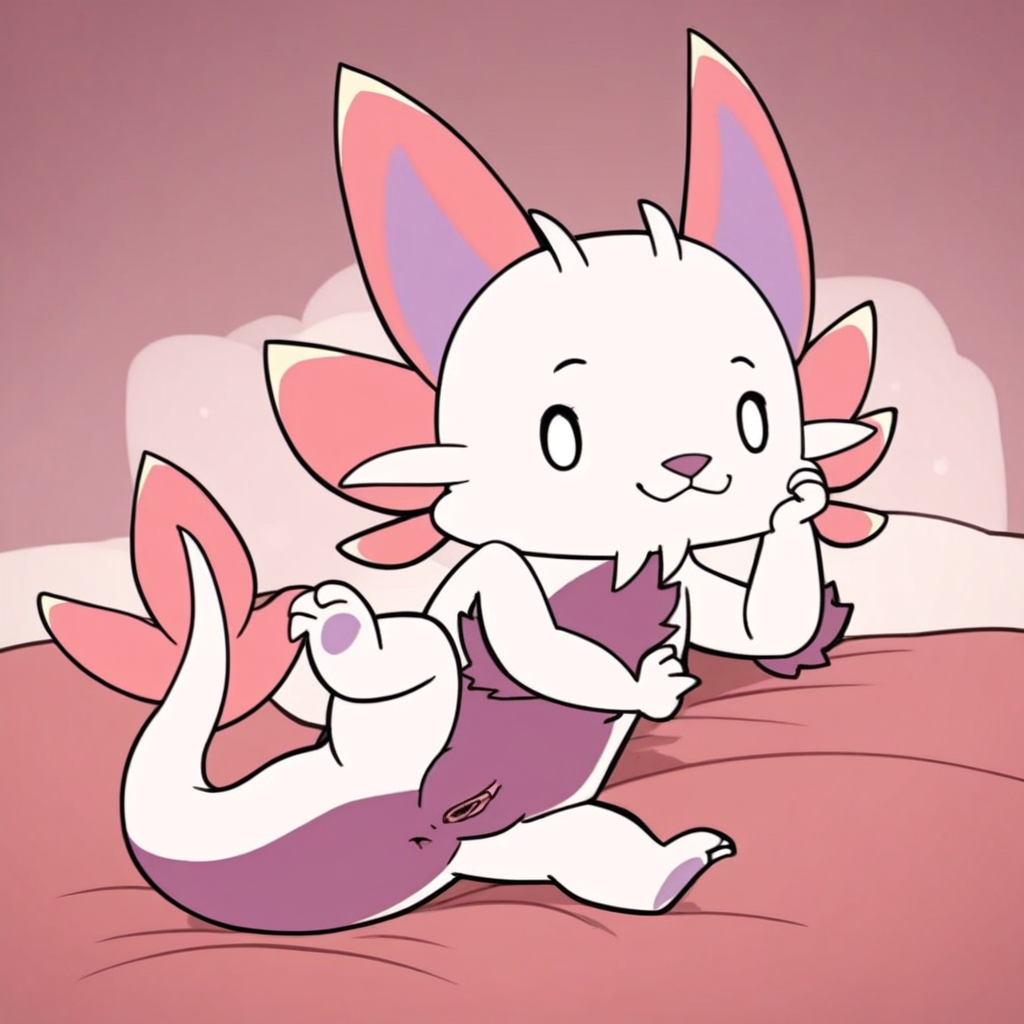 dragon, white and purple body, purple nose, blank eyes, chest tuft, elbow tuft, head fins, tail, tail fin,