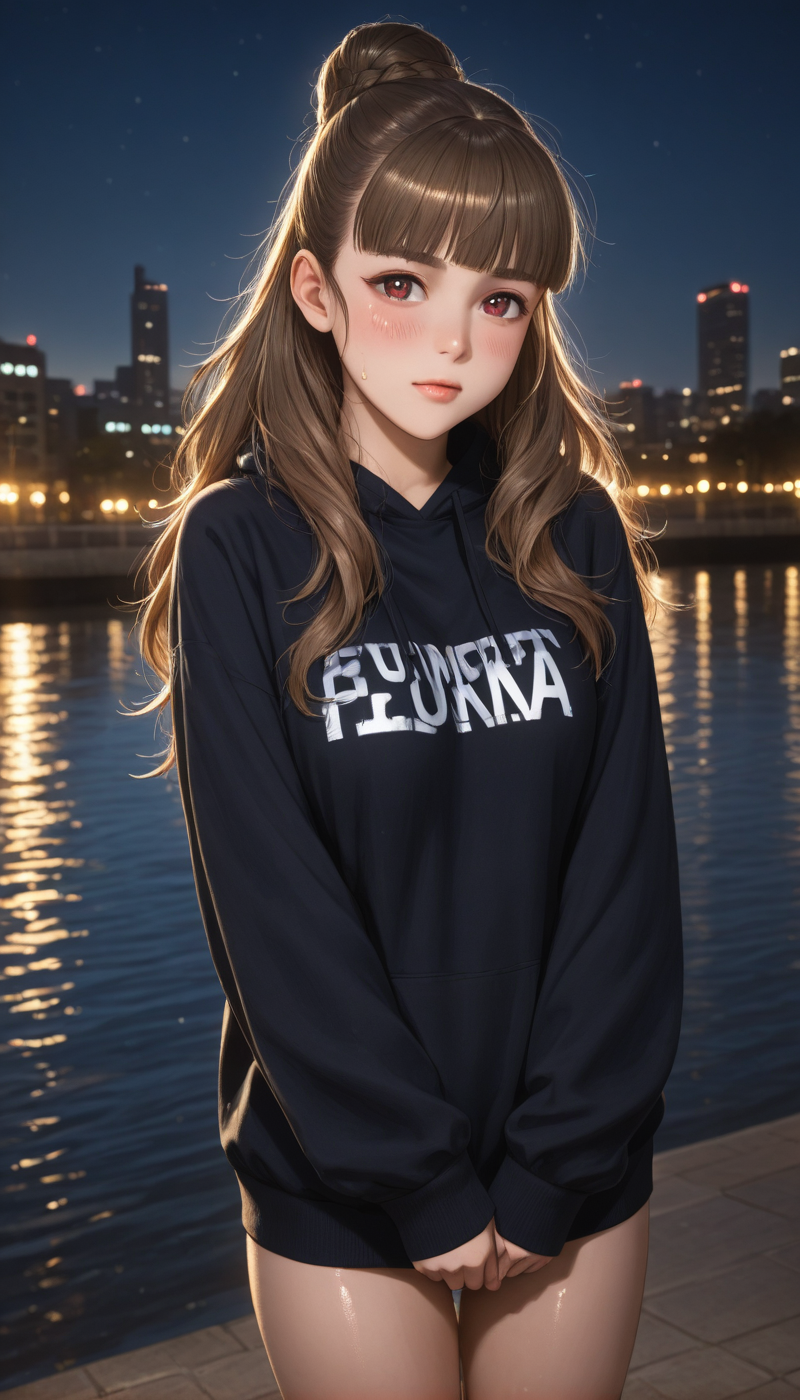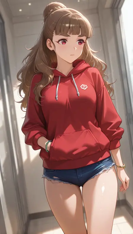 長袖、ジュエリー、太もも、ショートパンツ、フード、セーター、ブレスレット、短めのショートパンツ、フーディー、フードを下ろした状態、デニム、リストバンド、青いショートパンツ、デニムショートパンツ、ドローコード、マイクロショーツ、カットオフ、赤いフーディー、破れたショートパンツ、フード付きセーター、時計