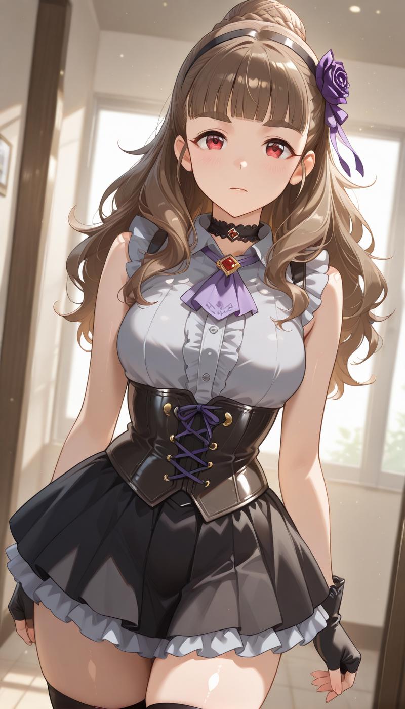 シャツ、スカート、髪飾り、手袋、太ももまであるストッキング、リボン、花、太もも、フリル、ヘアバンド、ノースリーブ、黒い手袋、チョーカー、黒い太ももまであるストッキング、黒いスカート、髪の花、ミニスカート、指なし手袋、絶対領域、ノースリーブシャツ、アスコット、黒いチョーカー、薔薇、太ももが太い、黒いヘアバンド、フリル付きスカート、グレーのシャツ、コルセット、広い hips、紫の花、紫のリボン、アンダーバスト、フリル付きチョーカー、黒い薔薇、紫のアスコット