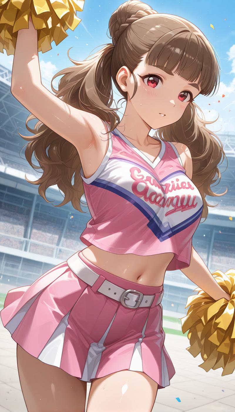 シャツ、スカート、髪飾り、手に持っている、肩出し、ツインテール、鎖骨、太もも、プリーツスカート、ノースリーブ、ベルト、お腹の部分、ミニスカート、脇の下、ノースリーブシャツ、スクンチー、髪のスクンチー、ピンクのスカート、ピンクのシャツ、チアリーダー、チアリーディング用ポンポン、コンフェッティ、お腹の部分が見える、ポンポンを手に持っている、へそ、服に文字が書かれている、