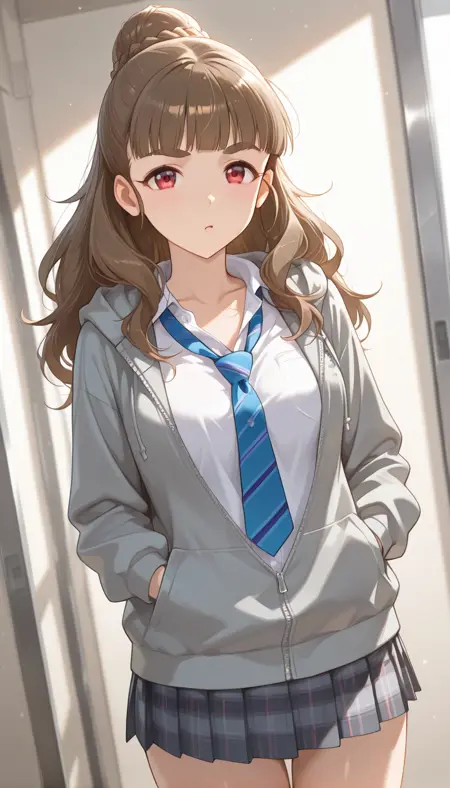 シャツ、スカート、長袖、ジャケット、制服、鎖骨、白いシャツ、プリーツスカート、開いた服、ネクタイ、襟付きシャツ、フード、ミニスカート、縦縞模様の服、開いたジャケット、チェック柄、ハoodie、チェック柄スカート、フードを下ろした状態、フード付きジャケット、グレーのスカート、青いネクタイ、グレーのジャケット、ドローコード、ジッパーが開いている、縦縞模様のネクタイ、部分的にジッパーが開いている、開いた襟、ゆるいネクタイ、斜め縞模様の服、斜め縞模様のネクタイ、