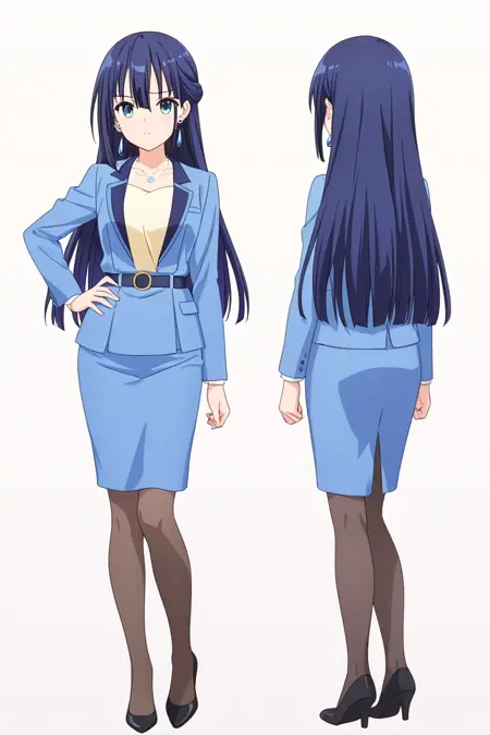 그녀는 파란 정장과 타이츠를 착용하며, 목걸이와 귀걸이도 착용한다.