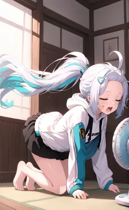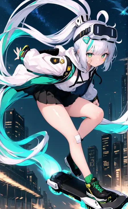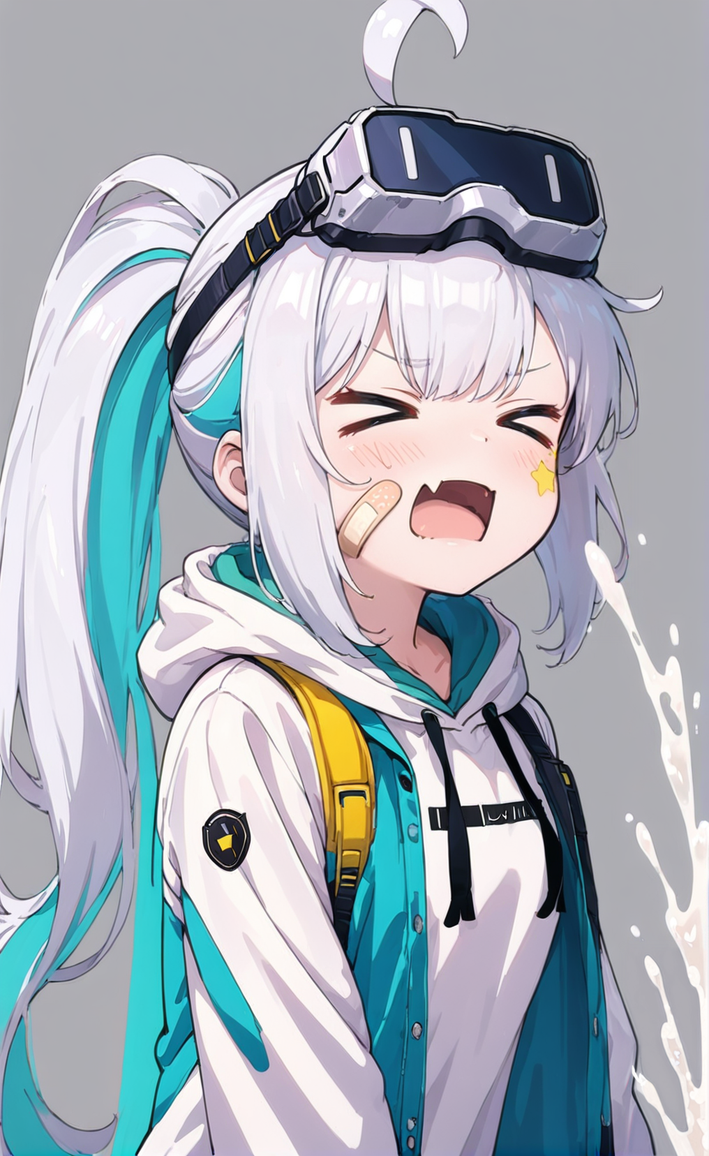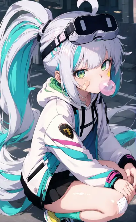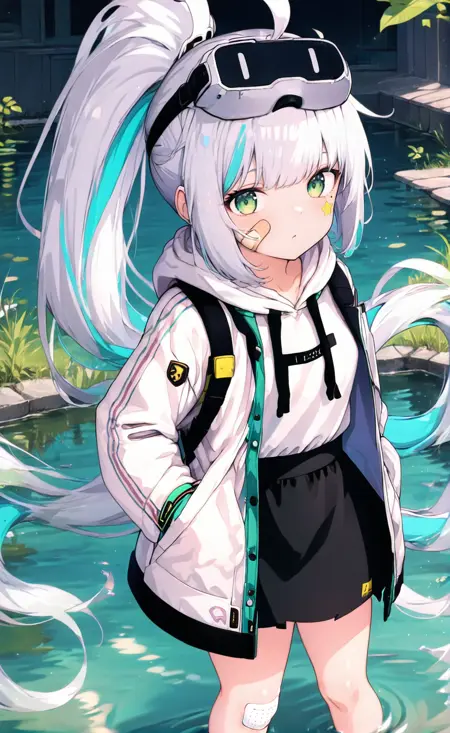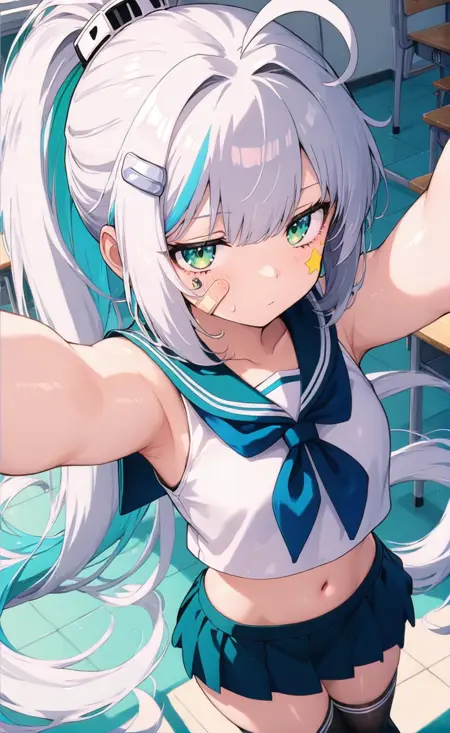 epinel、非常に長い髪、多色の髪、白髪、緑髪、ストライプ髪、ポニーテール、あほ毛、髪飾り、緑の目、絆創膏、頬の絆創膏、星(記号)、顔の模様、膝の絆創膏、