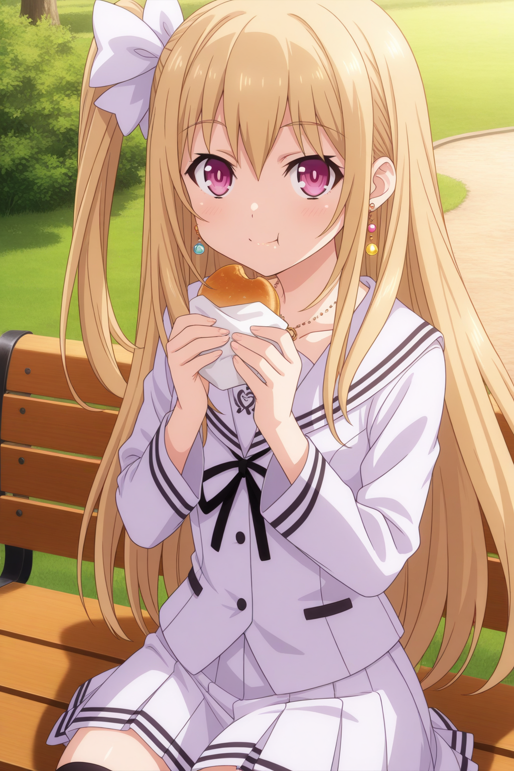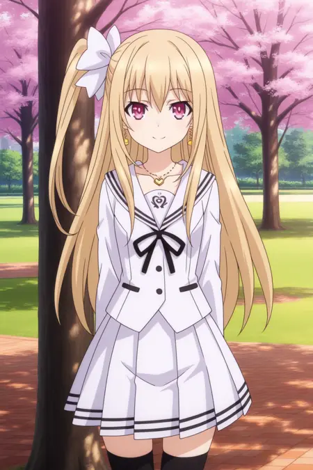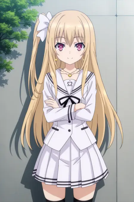aamayuri, 紫色の目, 金髪, 片側を上げたスタイル, 白い髪のリボン, 耳飾り, ネックレス, mayurischool, 白いセーラー collar, 黒いリボン, 白いセーラー服, 白いスカート, プリーツスカート, 黒いタイツ, アニメ風色塗り,