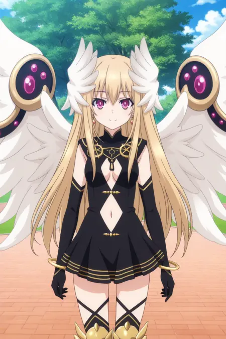 aamayuri, 紫色の目, 金髪, 頭に羽, mayurispirit, 黒いドレス, 短いドレス, 衣装のカットアウト, 胸元のカットアウト, おへそのカットアウト, 黒い手袋, 肘までの手袋, 金色のブレスレット, 膝上のブーツ, 脛当て, 白い翼, アニメ風色塗り,