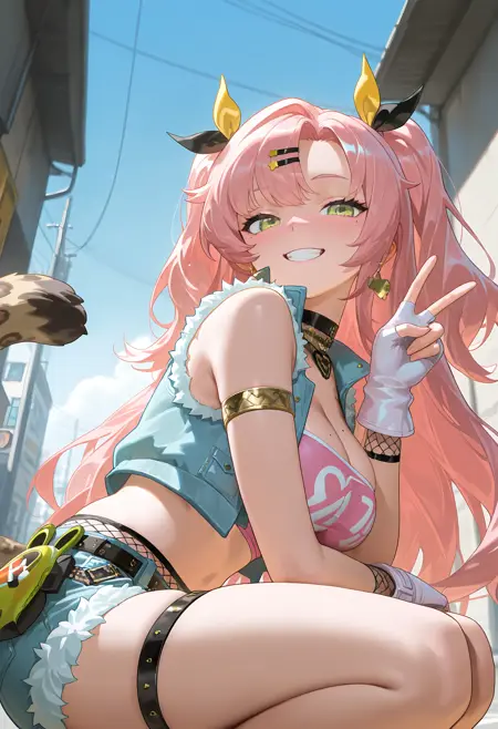 彼女の衣装2のタグ: bare shoulders, choker, midriff, white gloves, stomach, fingerless gloves, crop top, fur trim, short shorts, thigh strap, fishnets, armlet, blue shorts, pink shirt, denim shorts, yellow ribbon, leopard print, leopard tail, fur-trimmed shorts, belt, pink tube top, denim vest, sleeveless vest,