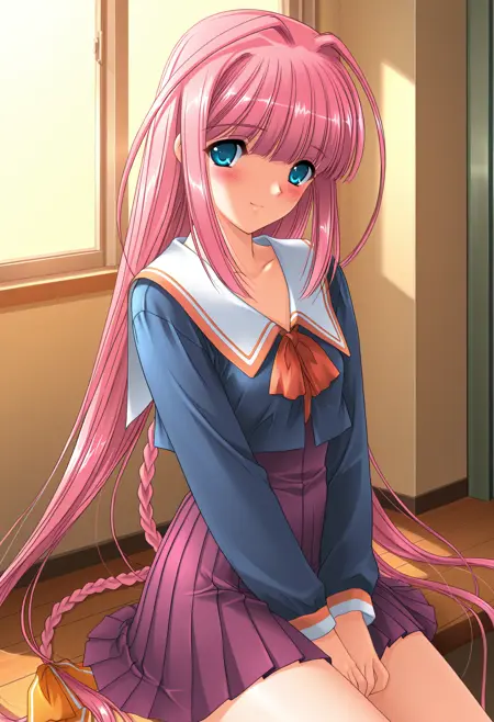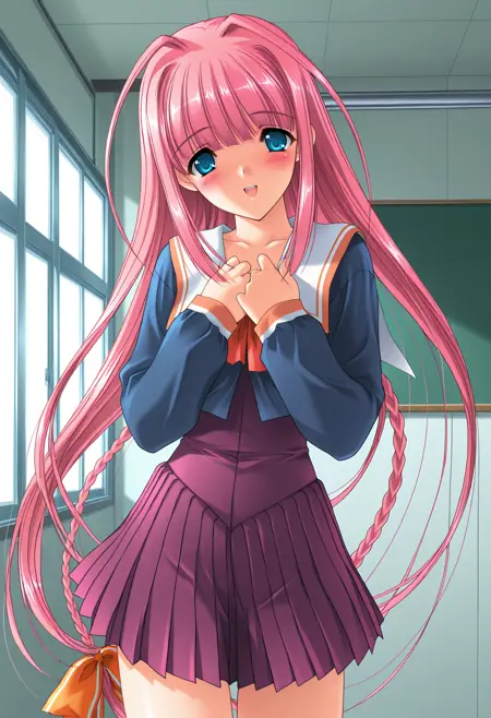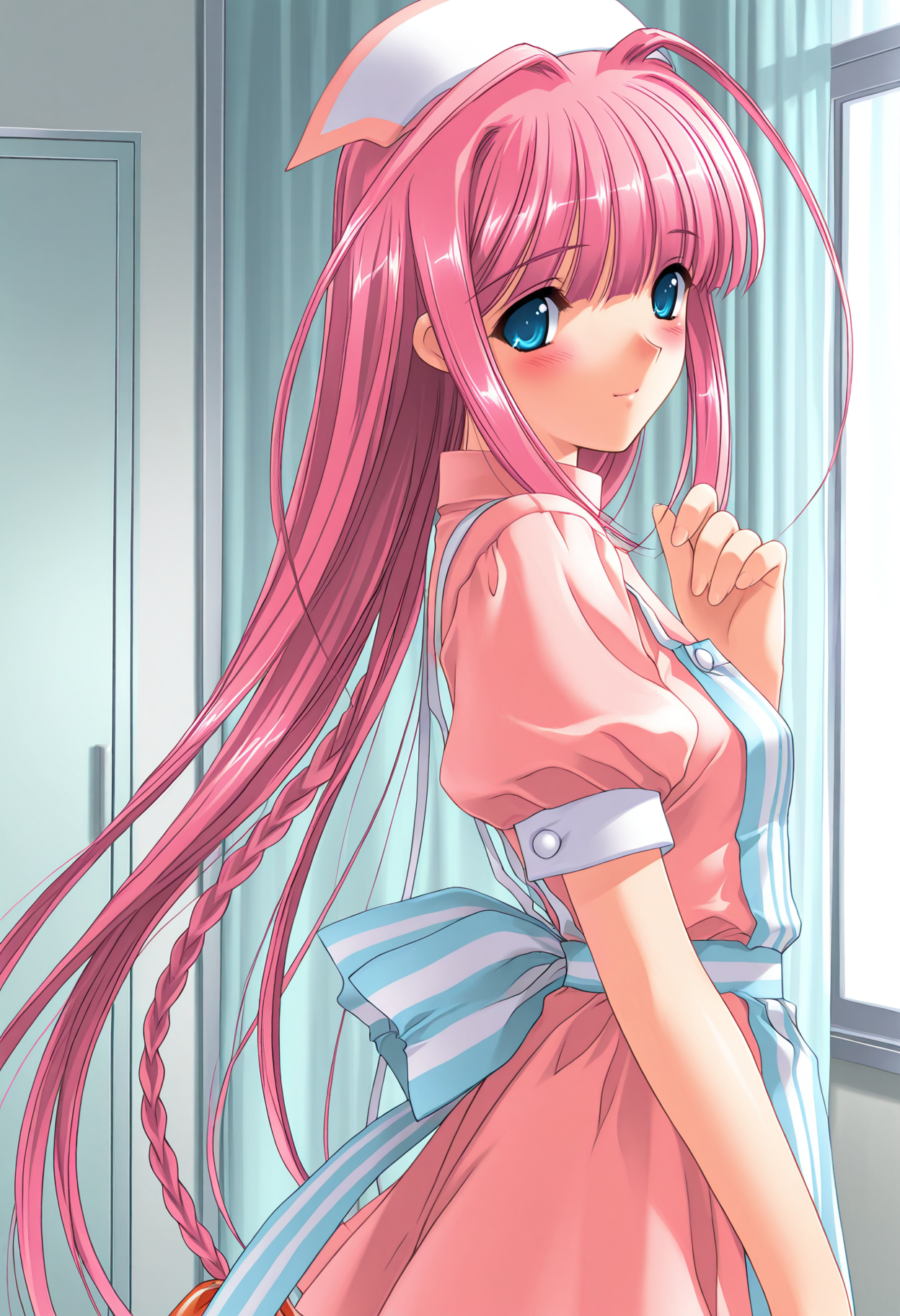 inblmyoz, 2000s \(스타일\), 분홍 머리, 매우 긴 머리, 파란 눈, 땋은 머리, 머리 리본,
