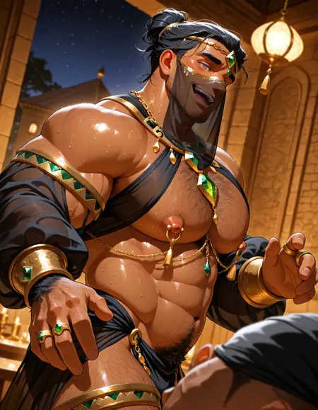 透明黑色中东宽松裤装,透明黑色阿拉伯服饰,透明面纱,发箍,臂甲,大腿护具,臂环,金色镶边,翡翠胸针,透明蓬松长袖,翡翠宝石,金色身体链,乳头穿环,金色流苏,金色戒指,角斗士凉鞋,