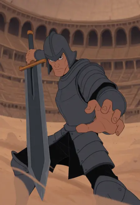 aladdn。这个风格色彩有点过饱和;我不太清楚为什么,但可以通过降低 CFG 值或对触发词加权来解决,例如(aladdn:0.75)。《巴黎圣母院的驼背》:
