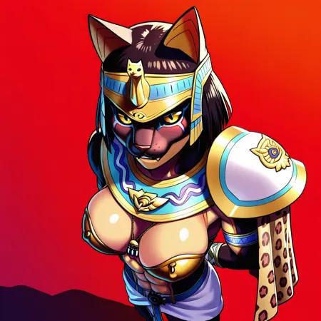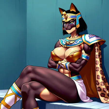 | 训练词汇 | Queen_Jaguar_Lord, 1girl, solo, black skin, dark-skinned female, muscular female, furry female, helmet, black hair, short hauir, yellow eyes, colored sclera, black sclera, animal ears, cat ears, armpits, one shoulder armor, asymmetrical cape, one shoulder cape, leopard print cape, egyptian clothes, armored bra, sandals已复制! |