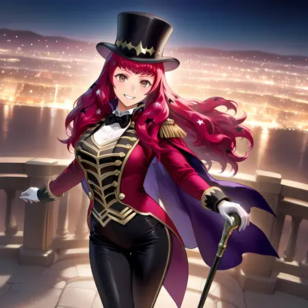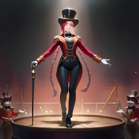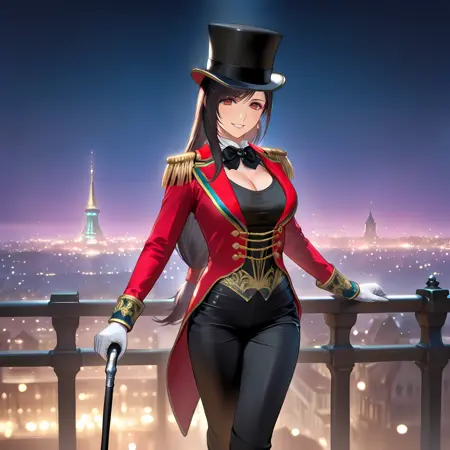 Additional: top hat, red jacket, long sleeves, black headwear, black footwear, cane, epaulettes, white gloves, jacket, black pants, black bowtie