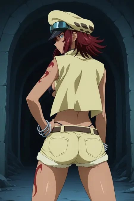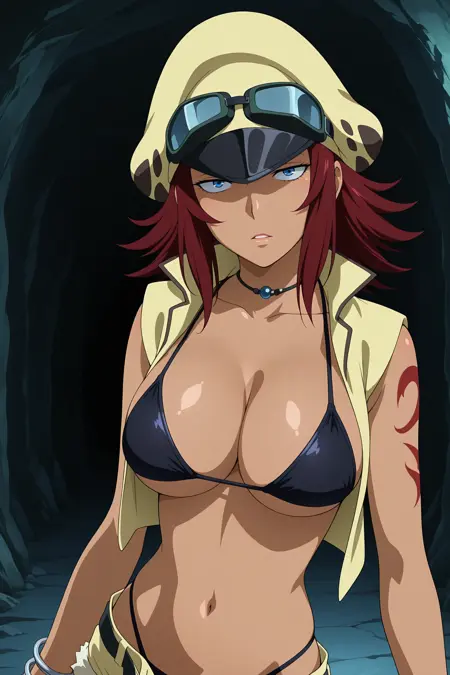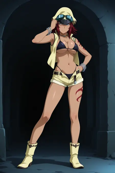 moukaku, medium hair, red hair, sidelocks, newsboy cap, goggles on headwear, blue eyes, constricted pupils, arm tattoo, leg tattoo, yellow vest, open vest, black bikini, string bikini, neck ring, bangle, belt, yellow shorts, short shorts, open fly, yellow footwear, boots