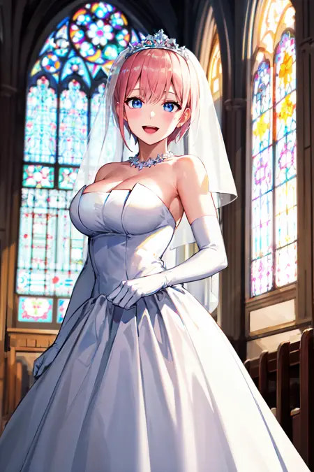 아우트핏4aaichika, 단발머리, 왕관, 웨딩 베일, 가슴 노출, 웨딩 드레스, 스트랩 없는 드레스, 흰색 드레스, 흰장갑, 팔꿈치 장갑