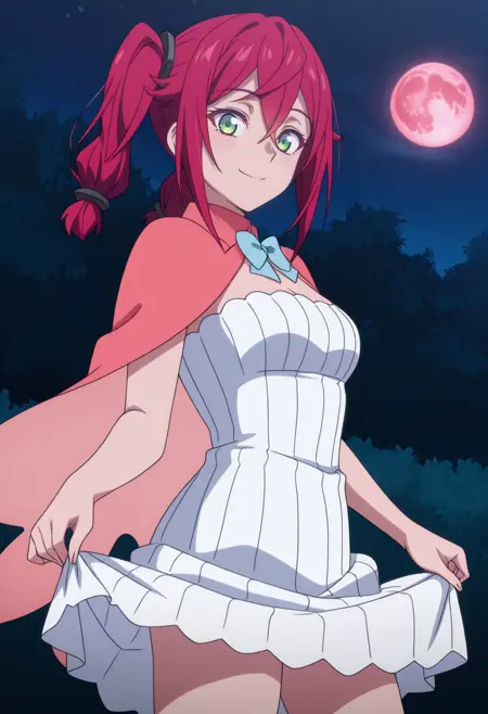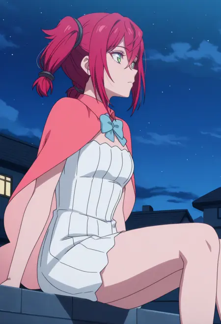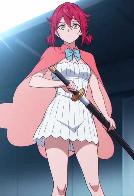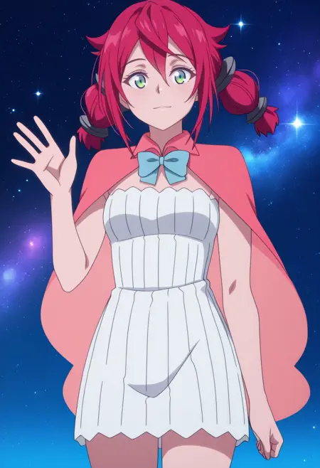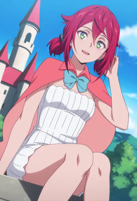 1girl,red short hair,pigtails,green eyes, | short white dress,sleeveless dress,short pink cape,light blue bow,bare legs, | anime screencap