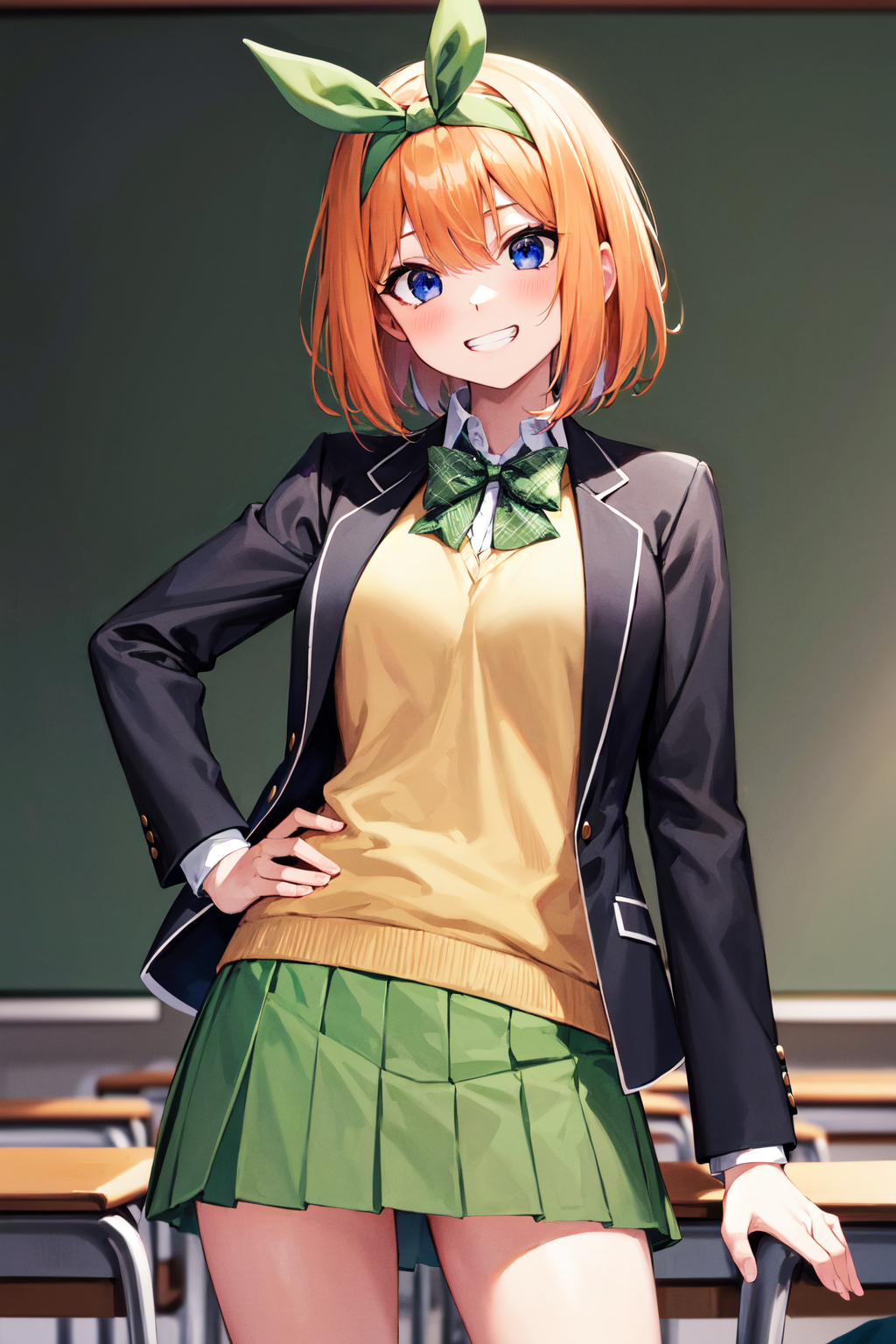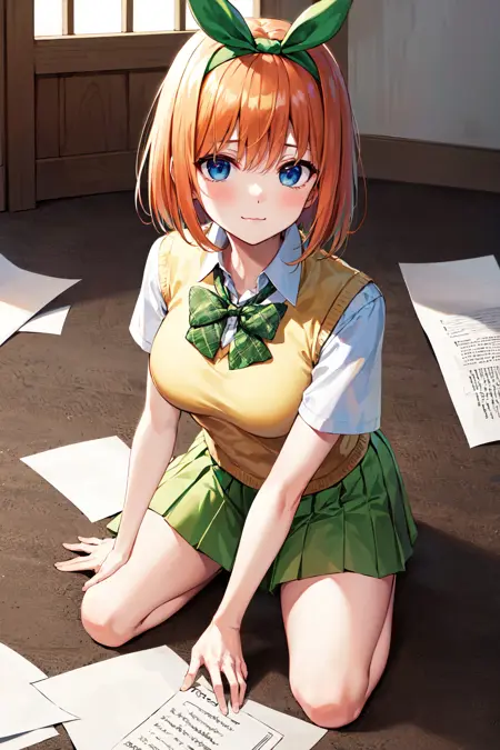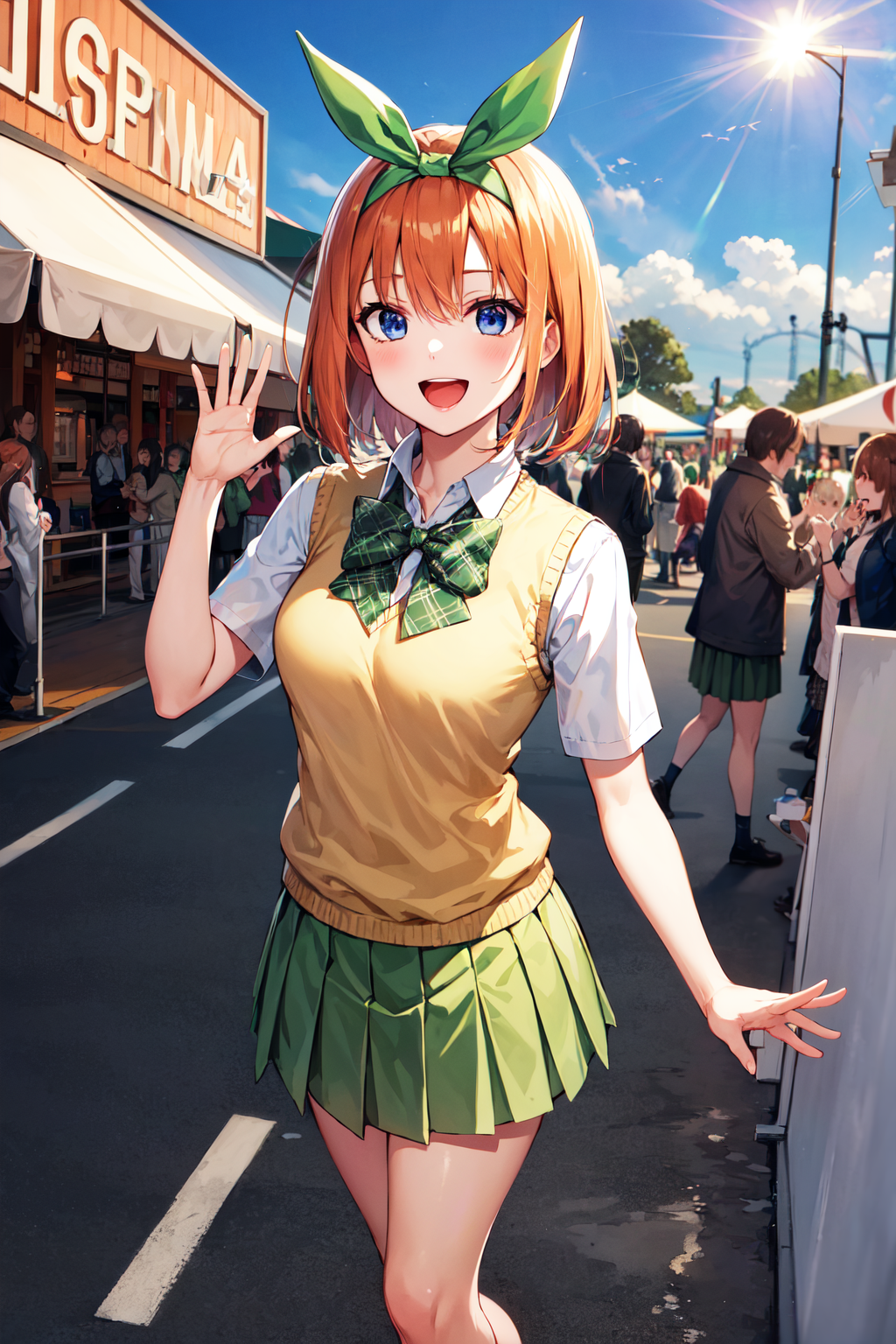 outfit2 (without jacket)aayotsuba, short hair, hair ribbon, green ribbon, hairband, green bow, collared shirt, sweater vest, yellow sweater, short sleeves, green skirt, pleated skirt