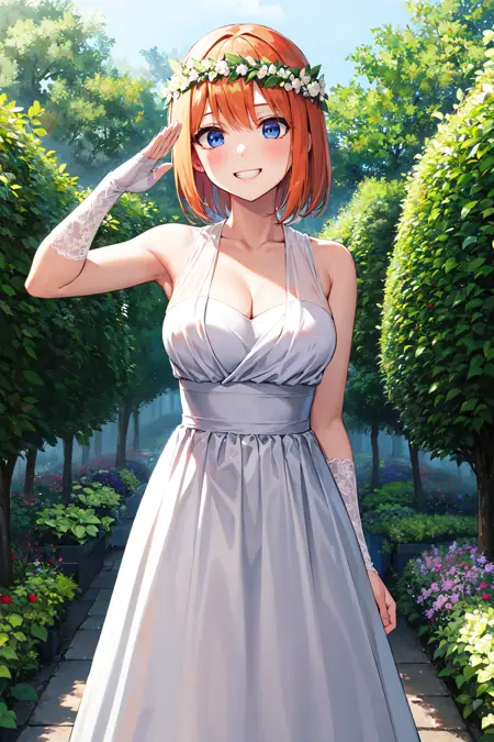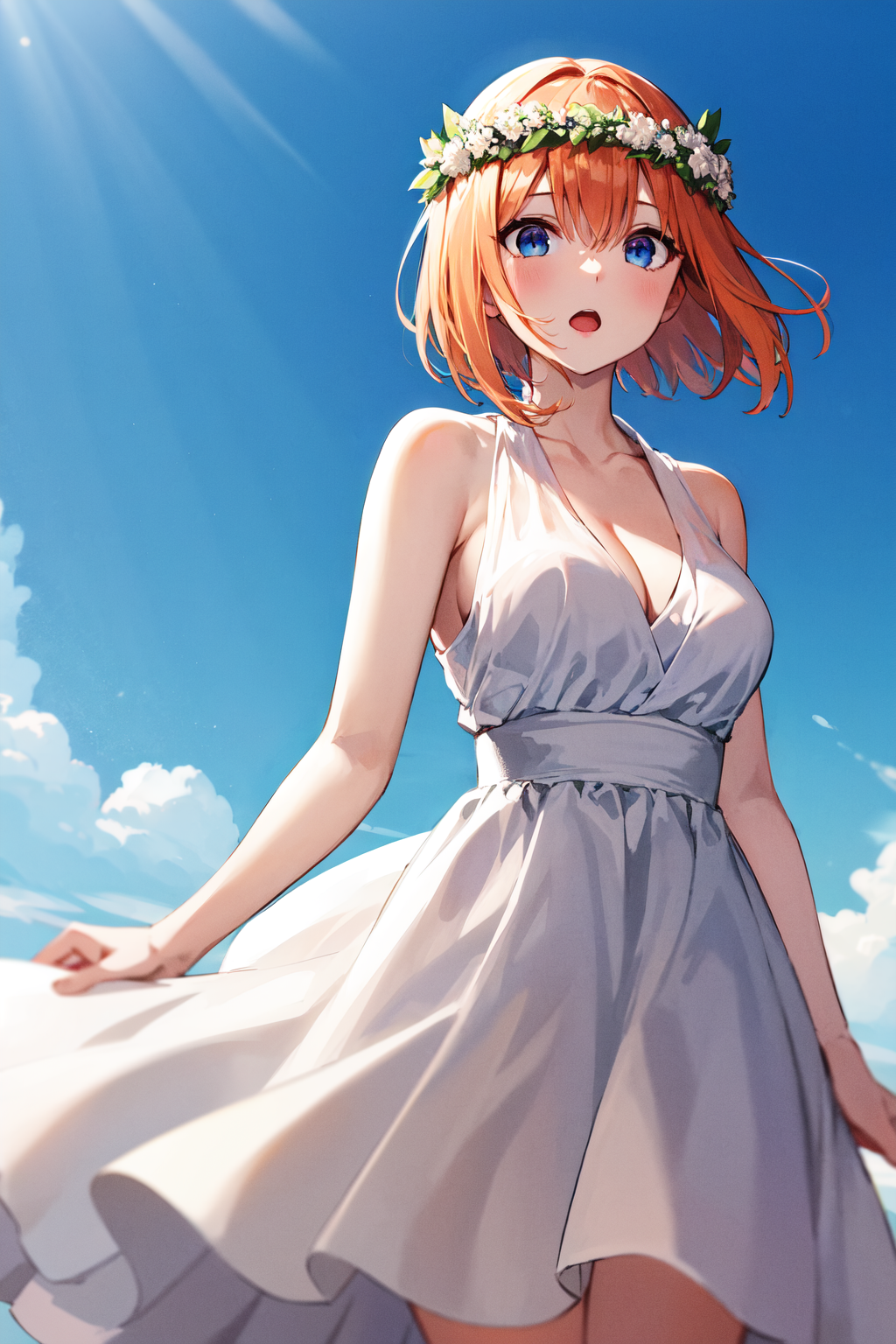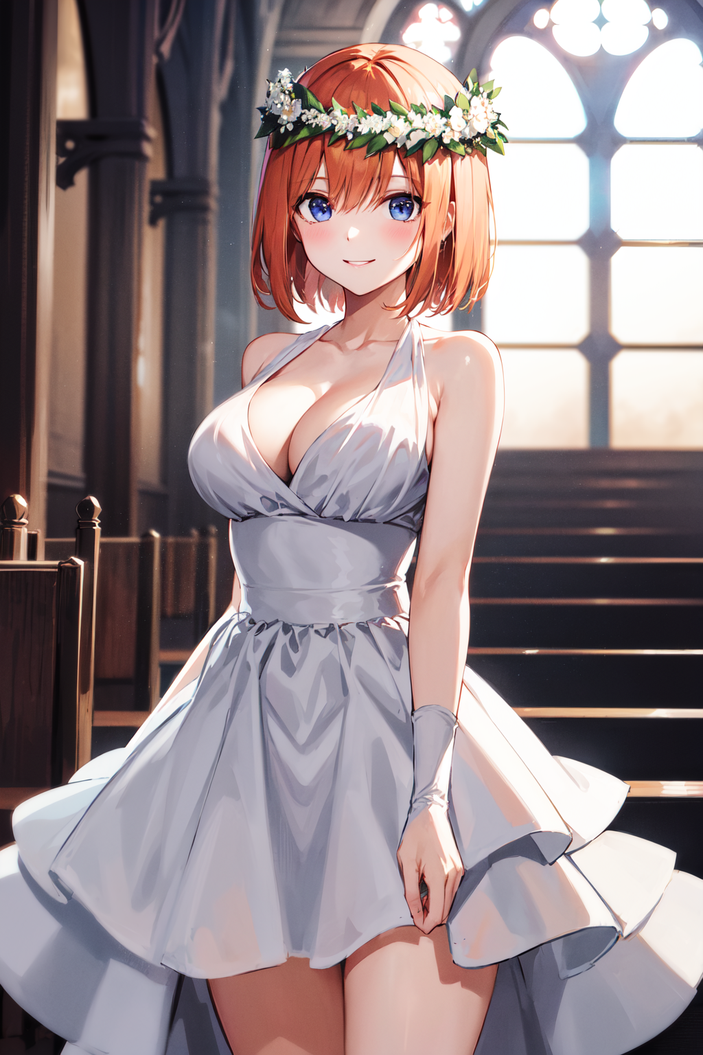 outfit3aayotsuba, short hair, head wreath, bare shoulders, cleavage, white dress, sleeveless dress, detached sleeves