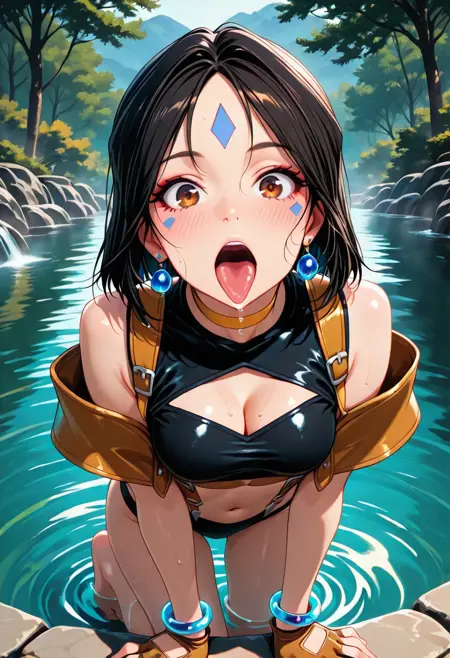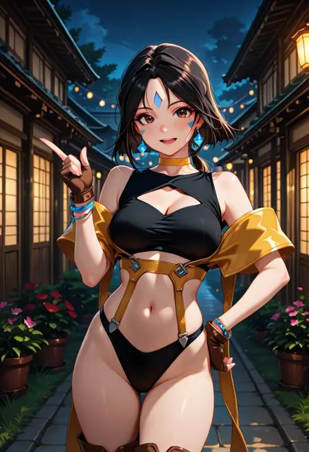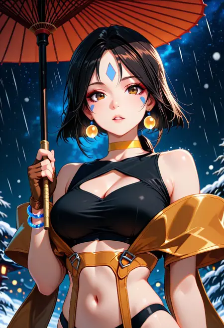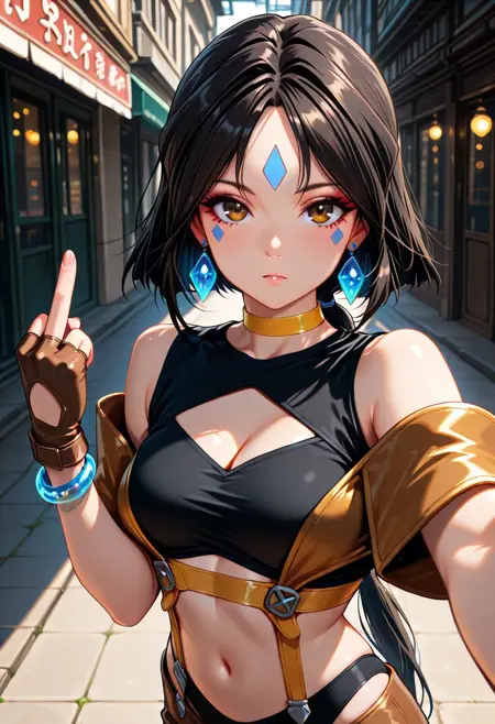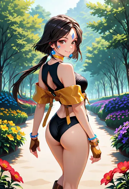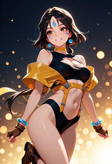 角色外观:短发、黑发、长马尾、棕眼、面部纹饰、额头纹饰、耳环、黄色项圈、手镯、中等胸部
