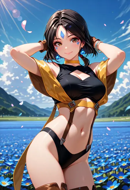 Character appearance: short hair, black hair, long ponytail, brown eyes, facial mark, forehead mark, earrings, yellow choker, bracelet, medium breasts,