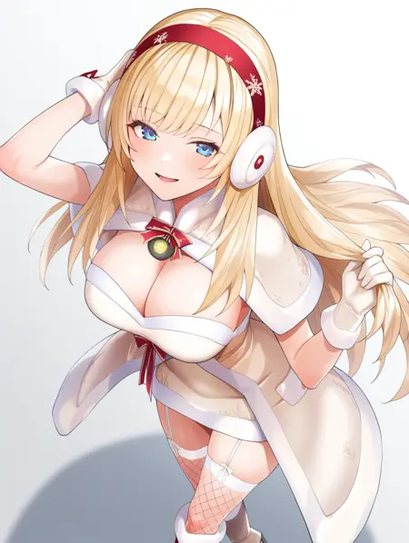 prompt example :sirayuki,blonde hair,long hair,blue eyes,headband,earmuffs,strapless dress,cleavage,capelet,gloves,fur trim,fishnet thighhighs,garter straps,high heel boots,coat,