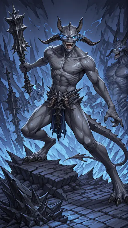 1boy, grey skin, blue eyes, horns, sharp teeth, glowing eyes,