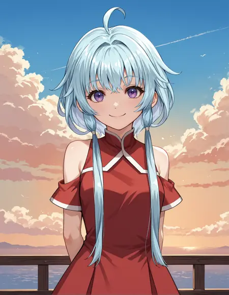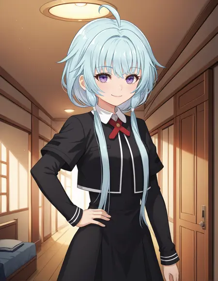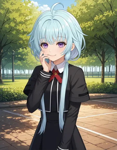 外貌: 浅蓝色头发,三尾辫,紫色眼睛