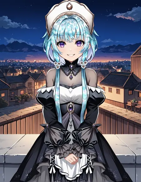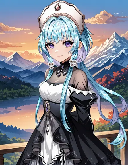 魔法服装: mgrcsenamikoto, smkmgc, (水晶发饰:0.7),白色帽饰,白色发夹,镶宝石的黑色可拆卸领子,灰色透明压缩上衣,白色上衣,黑色露肩荷叶边连衣裙,层叠的朱丽叶袖,黑色背部蝴蝶结,紫色腰饰,灰色荷叶边,白色荷叶边裙子,灰色连裤袜