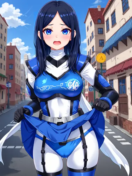 ak1bab1ue, white neck, white bodysuit, bodysuit under clothes, blue armor, boobplate, shoulder armor, elbow gloves, black gloves, black arm guards, silver belt, microskirt, blue skirt, blue thighhighs