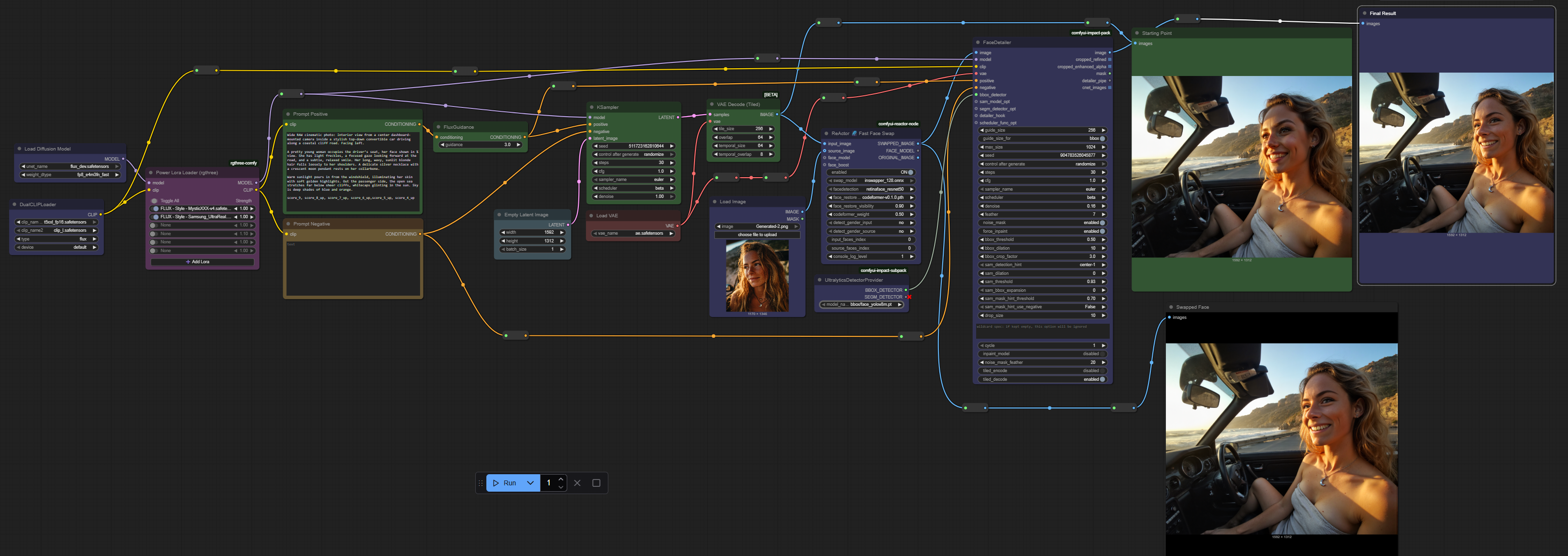 Fluxモデルを使用して画像を生成し、顔を入れ替えるための比較的簡単な方法を提供します。ReActorノードを使用しているため、いくつかの追加設定が必要な場合がありますが、その設定方法はGitHubで詳しく説明されています(https://github.com/Gourieff/ComfyUI-ReActor)。