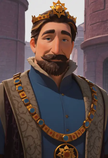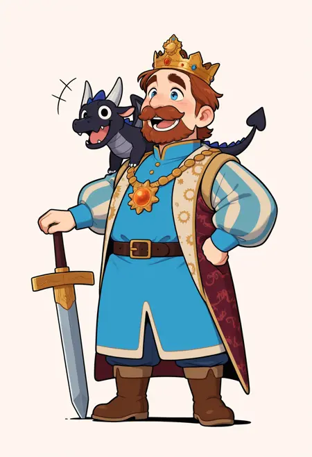 | 학습된 단어 | kingfrederic, mature male, brown hair, short hair, blue eyes, thick eyebrows, thick mustache, beard복사됨! dark-maroon surcoat, boots, brown footwear, crown, patterned coat, blue tunic, blue pants, puffy sleeves, striped sleeves, livery collar, sun ornament, dark-maroon belt복사됨! |