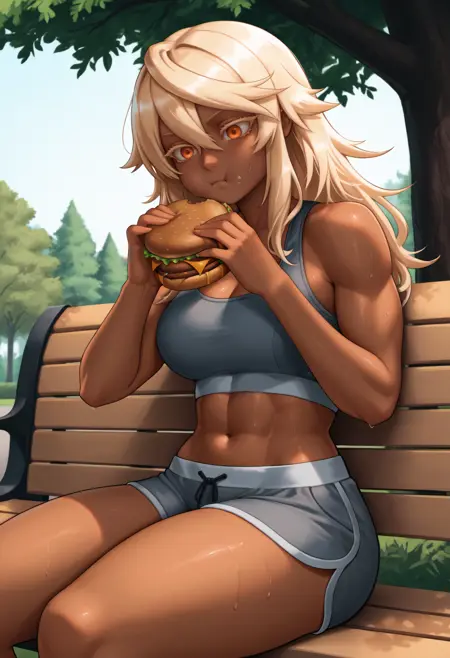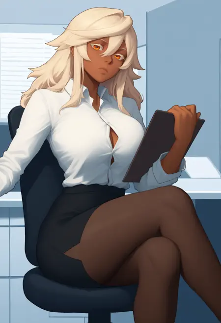 외모: 검은 피부를 가진 여자, 긴 머리, 금발, 눈 사이의 머리카락, 주황색 눈, 색상이 있는 속눈썹